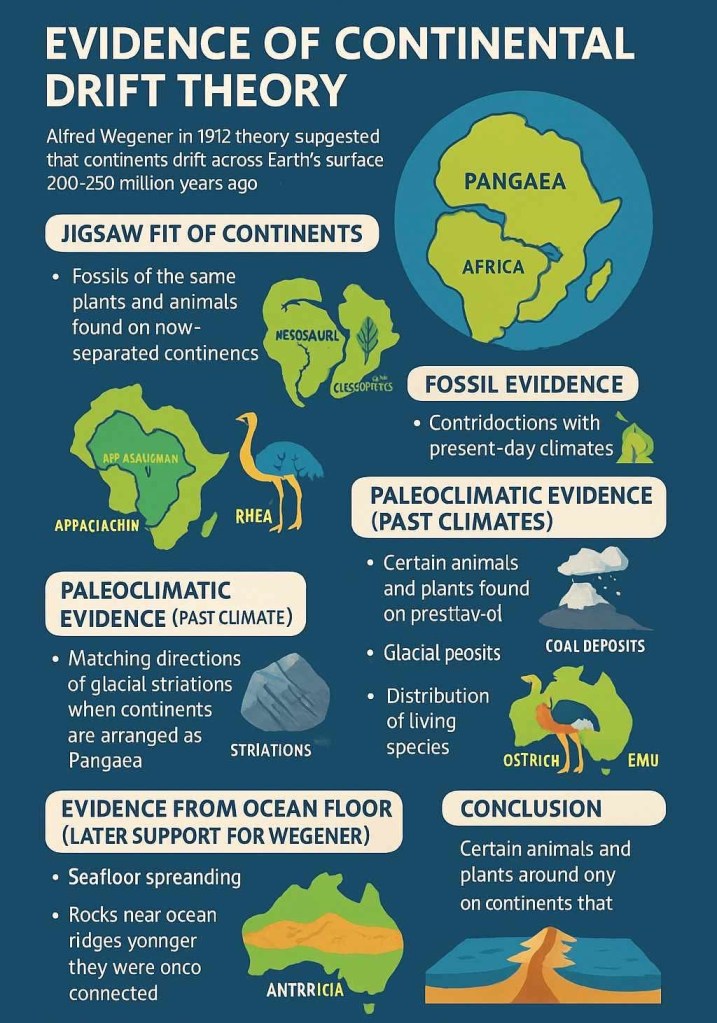 Evidence for continental drift includes the “jigsaw puzzle fit” of continents like South America and Africa, the discovery of similar fossils across distant continents, matching rock formations, and evidence of past climates such as glacial deposits found in now-tropical areas.